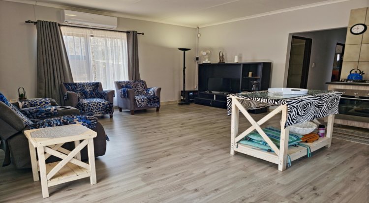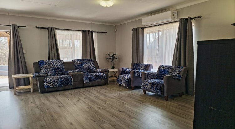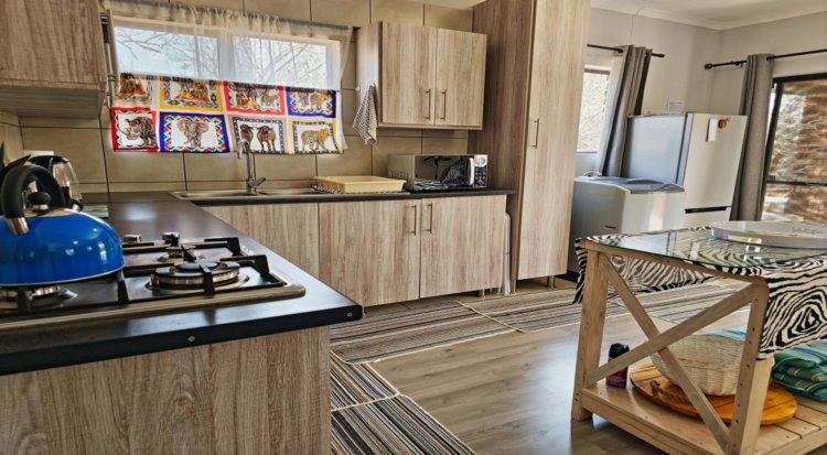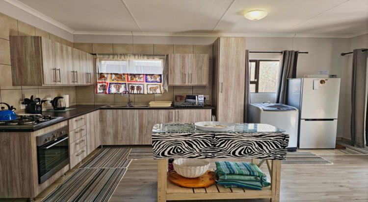 The home features two spacious bedrooms, each with its own en-suite bathroom, ensuring privacy and convenience for both residents and guests. The open-plan kitchen and family room create a welcoming space for entertaining, relaxing, or simply enjoying the peaceful ambiance of the bushveld.