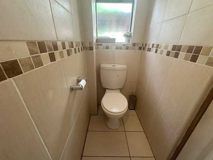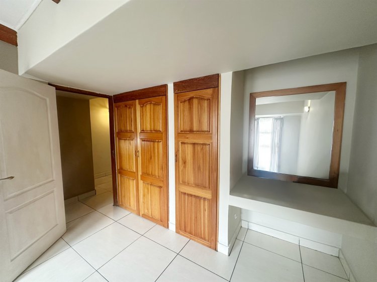 On the ground floor, the open-plan lounge and dining area flows into a modern kitchen. There’s a small study nook, perfect for working from home. The living area opens onto a private patio with a built-in braai, leading straight into the leafy communal garden. Ideal for outdoor entertaining. A private courtyard with a washing line adds convenience, and there’s also a guest loo downstairs.