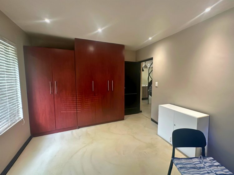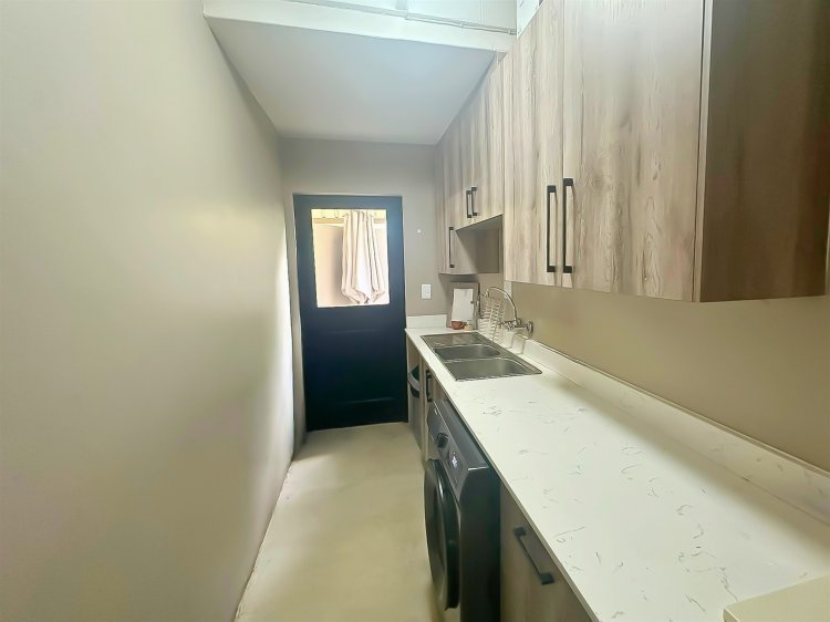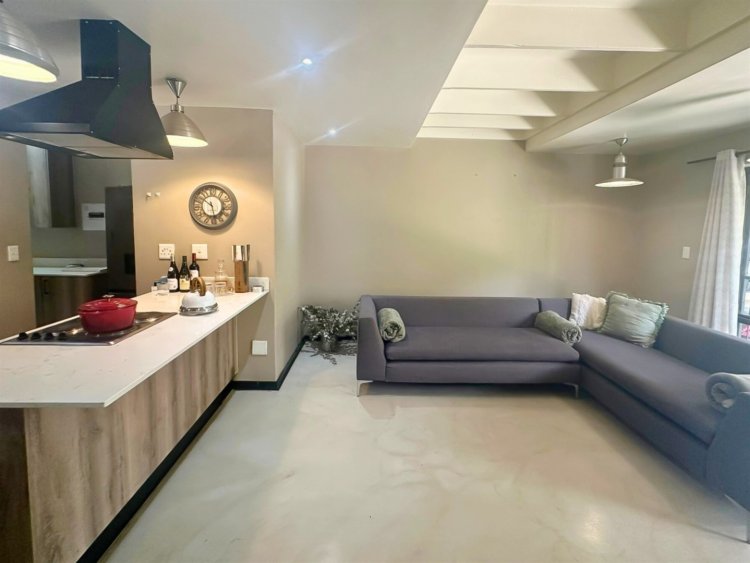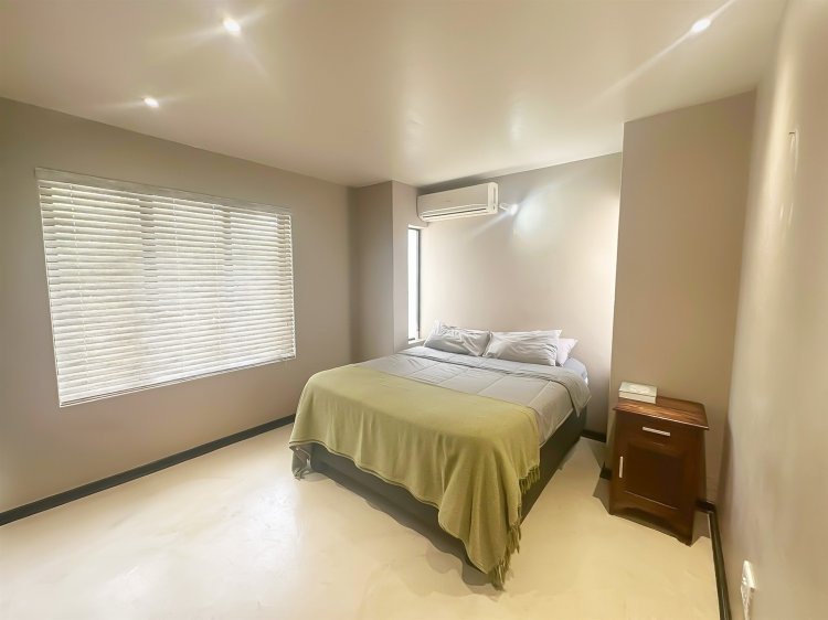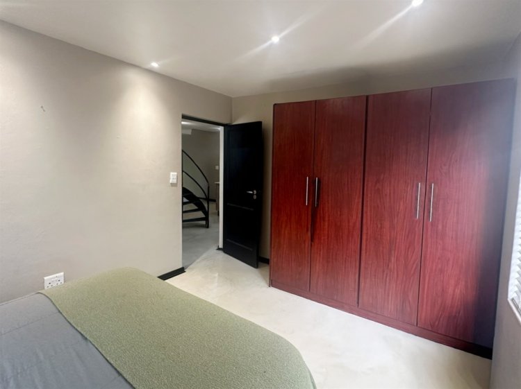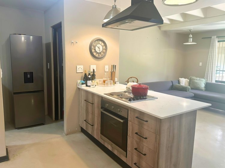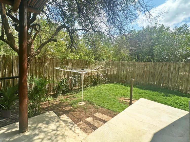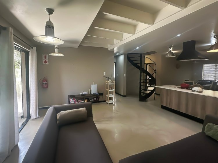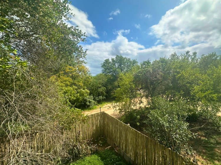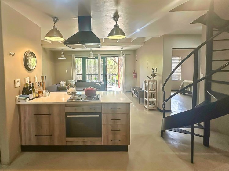 Located within the secure, gated community of Raptors Escape in Hoedspruit, this modern thatch home offers three air-conditioned bedrooms and two bathrooms. A wrought-iron spiral staircase leads to the loft bedroom, which features an en-suite bathroom and its own private patio. The two additional bedrooms and a full bathroom are positioned on the ground floor.