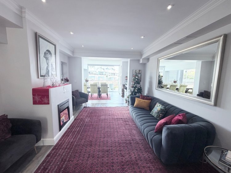 The cosy yet elegant living room features a wood-burning fireplace, adding warmth and charm during the cooler months.