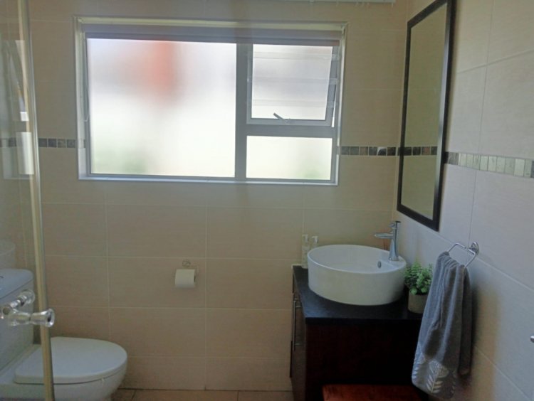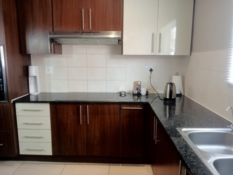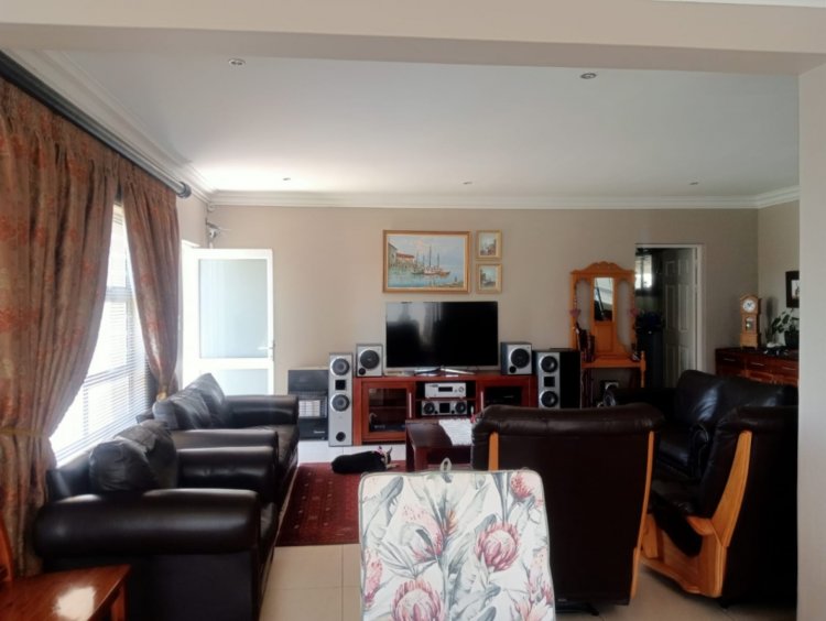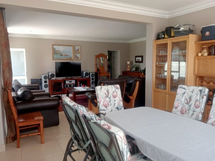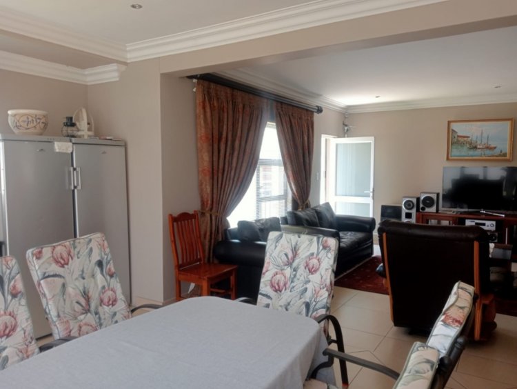The open-plan living area links the lounge and dining space to an inviting braai area, allowing the home to flow effortlessly for both everyday living and entertaining. The kitchen is fitted with modern finishes and ample built-in cupboards.