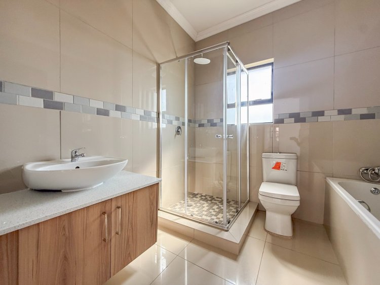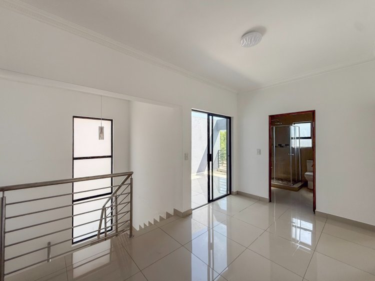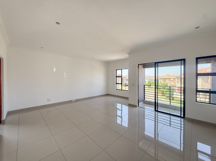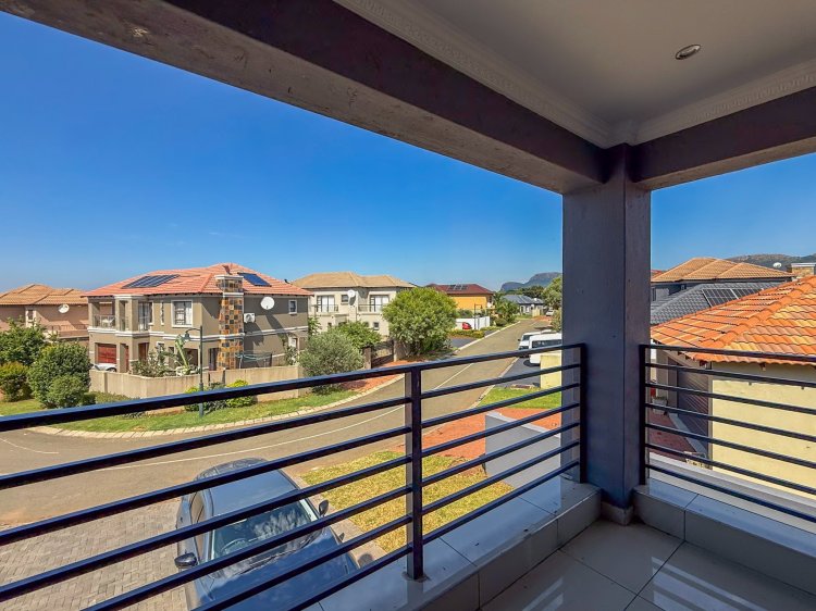 Living areas flow effortlessly to the outdoors, where two balconies frame scenic views of the Magaliesberg Mountains — perfect for morning coffee or unwinding at the end of the day. The property further benefits from a double automated garage and ample additional parking, catering comfortably to family and guests alike.