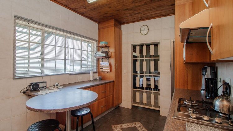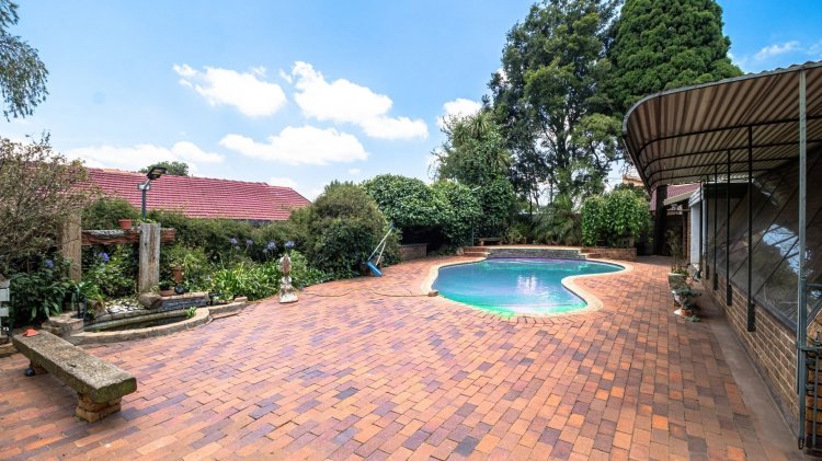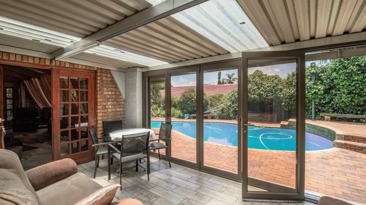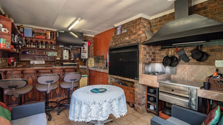 • A bar area fitted with a kitchenette and built-in braai • Two additional built-in gas braais • A lovely patio with stacking doors that open wide to the pool area • A large shade net in the backyard • In addition to two garages and carports for two vehicles, there’s an extra-length covered space that easily accommodates a caravan plus storage • Remote-controlled garage doors made of solid teak • A brand-new 3.5kVA inverter • Neatly enclosed with high palisade fencing • Solid construction